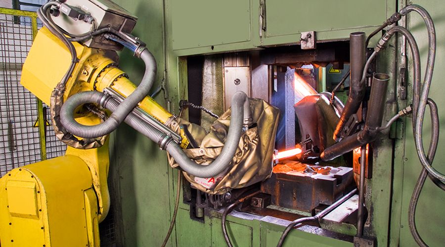 Der erste Schmiederoboter erleichtert die Schmiedearbeit und steigert weiter die Wirtschaftlichkeit.