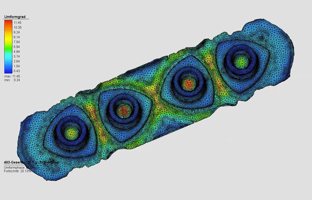 Durch Simulation des Umformprozesses können wir die produktionstechnischen Details frühzeitig erkennen und die Werkzeuge und Fertigungsprozesse optimal aufeinander abstimmen. So kann die Fertigung bereits zu Vorserienbeginn mit optimierten Werkzeugen beginnen.